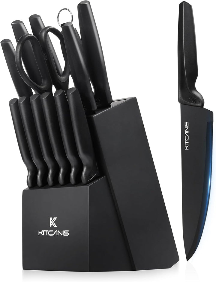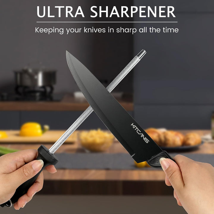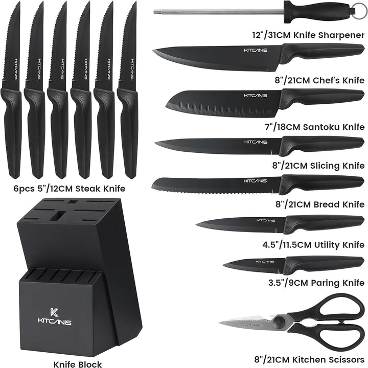 KITCANIS Knife Set with Block,15pcs Kitchen Knife Sets,High Carbon Stainless Steel Knife Set with Sharpener,Black Knife Block Set for Chopping, Slicing, Dicing Cutting