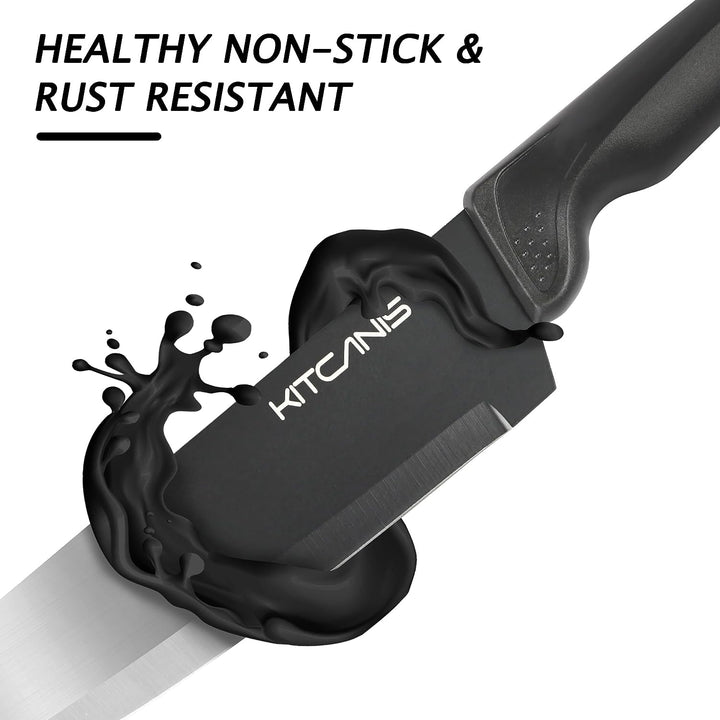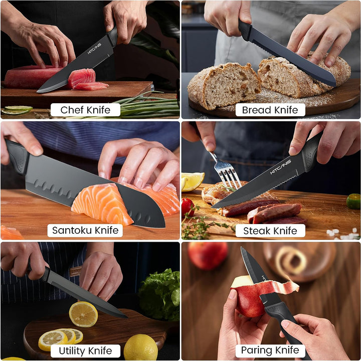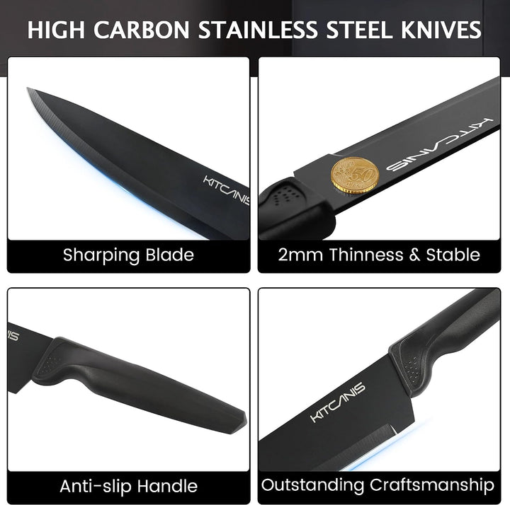 - š„ćHigh-quality Kitchen Knife SetćThe Professional kitchen knife set adopt X50Cr15 high quality carbon stainless steel,with a black coating that prevents oxidation of the steel,the kitchen knife set will last a long time and remain non-stick and rust resistant. harder than normal knife steel, holding the sharp edge for longer.(Note: Please dry the water after use to avoid rusting easily!)